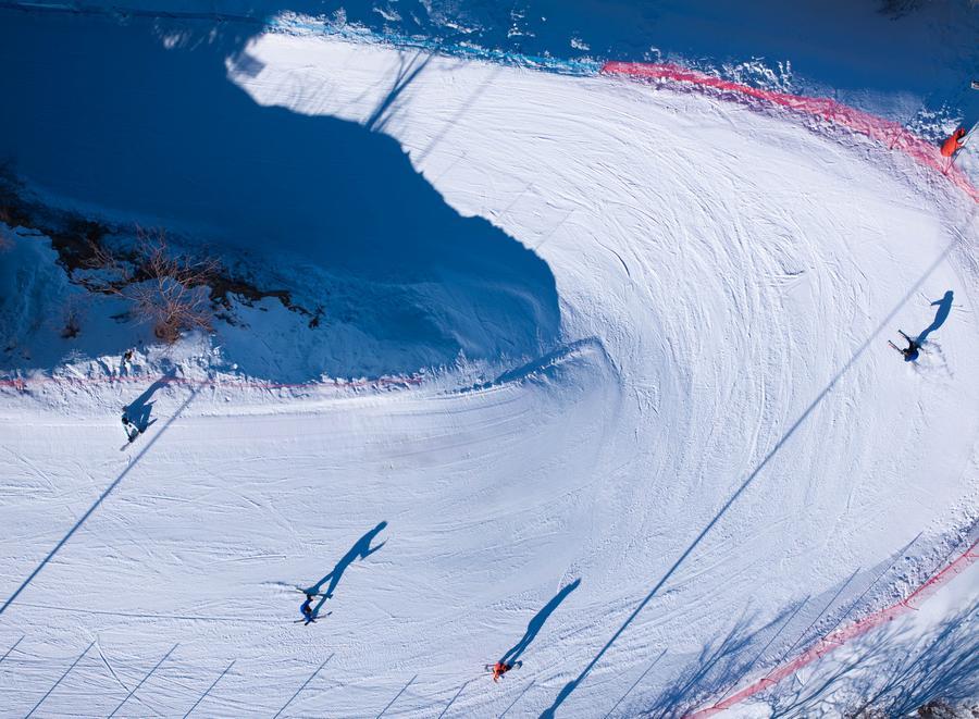 Vista aérea tomada con un dron el 13 de enero de 2026 de personas esquiando en una estación de esquí, en Almaty, Kazajistán.…
