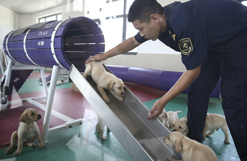 Un entrenador trabaja con perros labradores de 5 semanas de edad en el Centro de Capacitación Canina de la Administración General de Aduanas de Beijing. (Foto: Zou Hong)