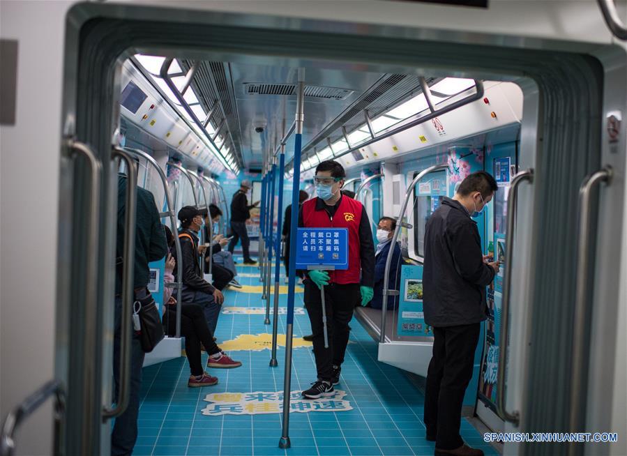 WUHAN, 22 abril, 2020 (Xinhua) -- Pasajeros viajan a bordo de un tren de la línea uno del metro en Wuhan, provincia de Hubei, en el centro de China, el 22 de abril de 2020. Toda la red de transporte ferroviario y de autobuses reanudó sus operaciones en Wuhan el 22 de abril. (Xinhua/Xiao Yijiu)