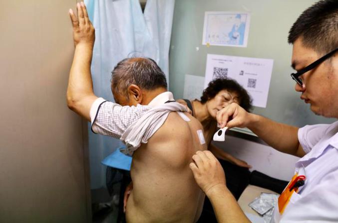 Un médico le coloca apósitos sanfutie a un hombre en el Hospital de Amistad China-Japón en Beijing, 12 de julio del 2017. [Foto: Zhu Xingxin/China Daily]