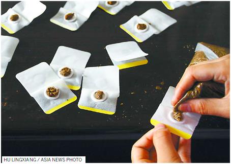 Estos parches se han utilizado en la medicina tradicional china desde los tiempos más antiguos registrados según el Huangdi Neijing (El Canon Interno del Emperador Amarillo), hace más de 2,000 años. [Foto: Hu Lingxiang / Asia News Photo]