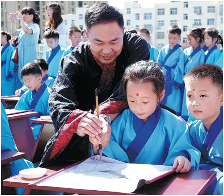 Un profesor asesora a una estudiante sobre caligrafía durante un evento cultural en la Escuela Primaria Experimental Licang de Qingdao, en la provincia de Shandong, 8 de noviembre del 2020. [Foto: proporcionada a China Daily]