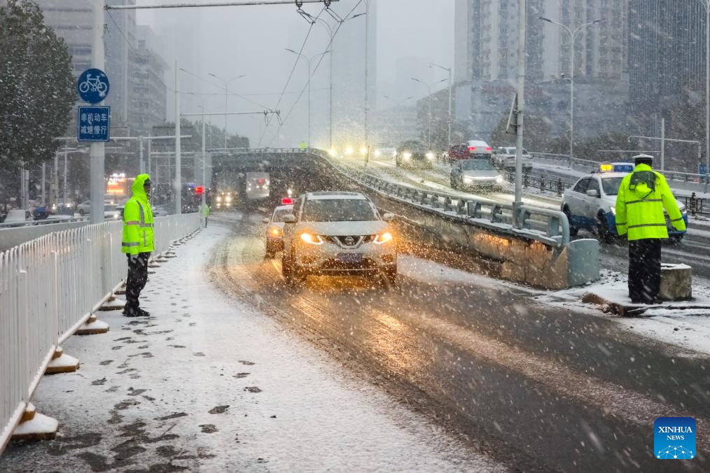 BEIJING, 20 enero, 2026 (Xinhua) -- Oficiales de policía dirigen el tráfico cerca del puente Jianghan, en Wuhan, en la provincia de Hubei, en el centro de China, el 20 de enero de 2026. En relación con las nevadas generalizadas y los descensos de temperatura en varias regiones de China, se han tomado medidas para responder activamente a estas condiciones meteorológicas. (Xinhua/Xiao Yijiu)