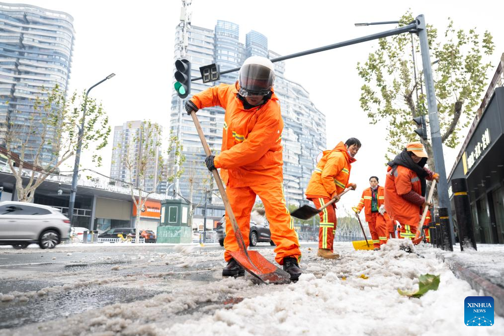 BEIJING, 20 enero, 2026 (Xinhua) -- Trabajadores de limpieza retiran la nieve de una carretera, en el distrito de Wuchang de Wuhan, en la provincia de Hubei, en el centro de China, el 20 de enero de 2026. En relación con las nevadas generalizadas y los descensos de temperatura en varias regiones de China, se han tomado medidas para responder activamente a estas condiciones meteorológicas. (Xinhua/Xiao Yijiu)