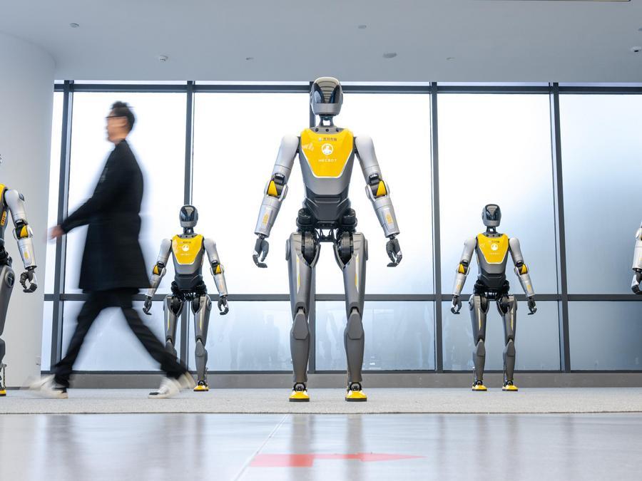 Un visitante pasa junto a robots exhibidos en un centro de innovación de robots humanoides en la Zona de Desarrollo de Alta Tecnología del Lago Este de Wuhan, también conocida como el Valle Óptico de China, en Wuhan, provincia central China de Hubei, el 4 de diciembre de 2025. (Xinhua/Xiao Yijiu)