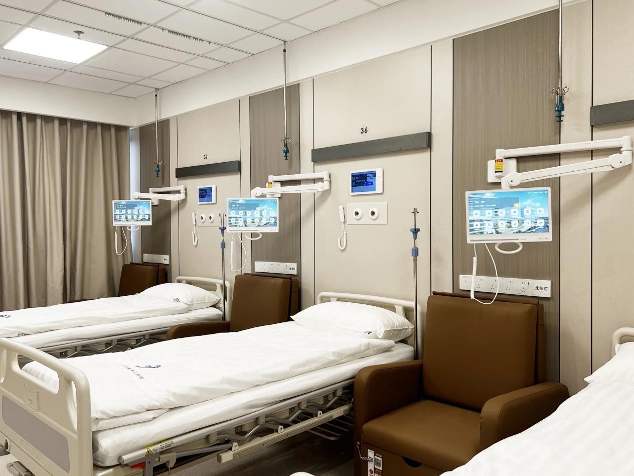 En las salas del Hospital Popular de la Nueva Área de Chongqing Liangjiang, en el municipio de Chongqing, suroeste de China, los pacientes pueden ajustar la iluminación, correr las cortinas y ver sus constantes vitales en tiempo real con un simple toque en una pantalla interactiva junto a la cama. Un sistema inteligente de monitorización de infusiones sincroniza el progreso de las infusiones en todas las camas, mientras que un radar de ondas milimétricas y dispositivos portátiles monitorizan simultáneamente la frecuencia cardíaca y la respiración.