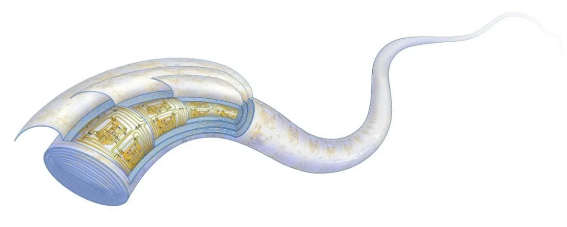 El primer gran obstáculo son las limitaciones espaciales. Aprovechando el potencial del espacio interno, el equipo de investigación adoptó un enfoque novedoso, construyendo circuitos helicoidales multicapa para maximizar la utilización del interior de la fibra. Basándose en la precisión de litografía de un micrón del laboratorio, una fibra de un mm de longitud puede integrar actualmente 10,000 transitores, comparable con algunos chips de implantes médicos comerciales. La capacidad de integración de transistores de una fibra de un metro de longitud podría alcanzar el nivel de la unidad central de procesamiento de una computadora clásica.