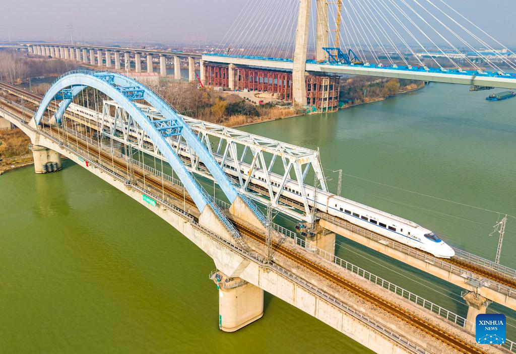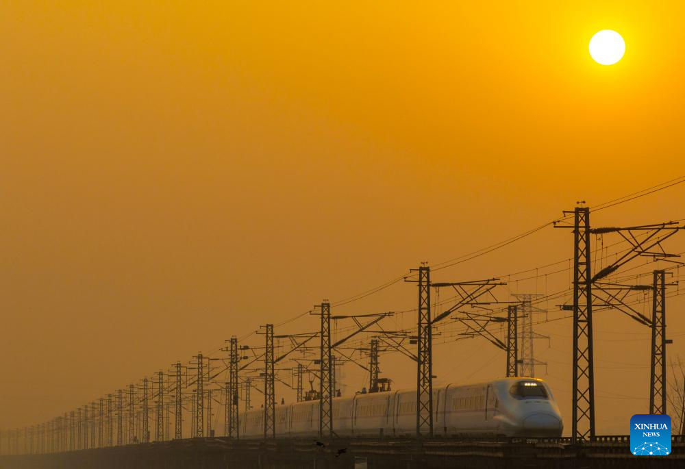 BEIJING, 25 enero, 2026 (Xinhua) -- Imagen tomada con un dron el 25 de enero de 2026 de un tren bala circulando en una sección del Ferrocarril Ningxia-Qidong, en Yangzhou, en la provincia de Jiangsu, en el este de China. Un nuevo horario de tren tomará efecto en China desde el 26 de enero de 2026. (Xinhua/Ren Fei)