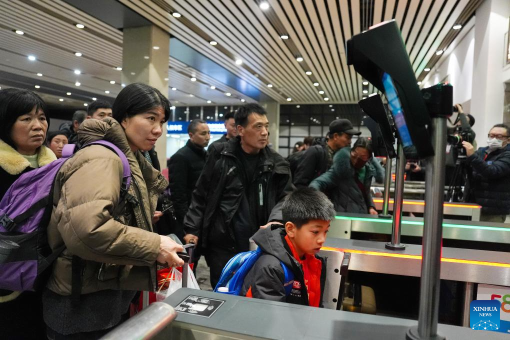 BEIJING, 2 febrero, 2026 (Xinhua) -- Imagen del 1 de febrero de 2026 de pasajeros pasando por torniquetes para abordar el tren número K4069 en la Estación de Ferrocarriles del Oeste de Beijing, en Beijing, capital de China. China dio comienzo el lunes a la mayor migración anual de su población, 15 días antes del Festival de la Primavera de 2026, tradicional celebración que también es conocida como el Año Nuevo chino. Se prevé que los viajes de pasajeros alcancen un total de 9.500 millones durante este período de movilidad intensa, que este año finalizará el 13 de marzo, cifra que representaría un récord histórico. (Xinhua/Ju Huanzong)