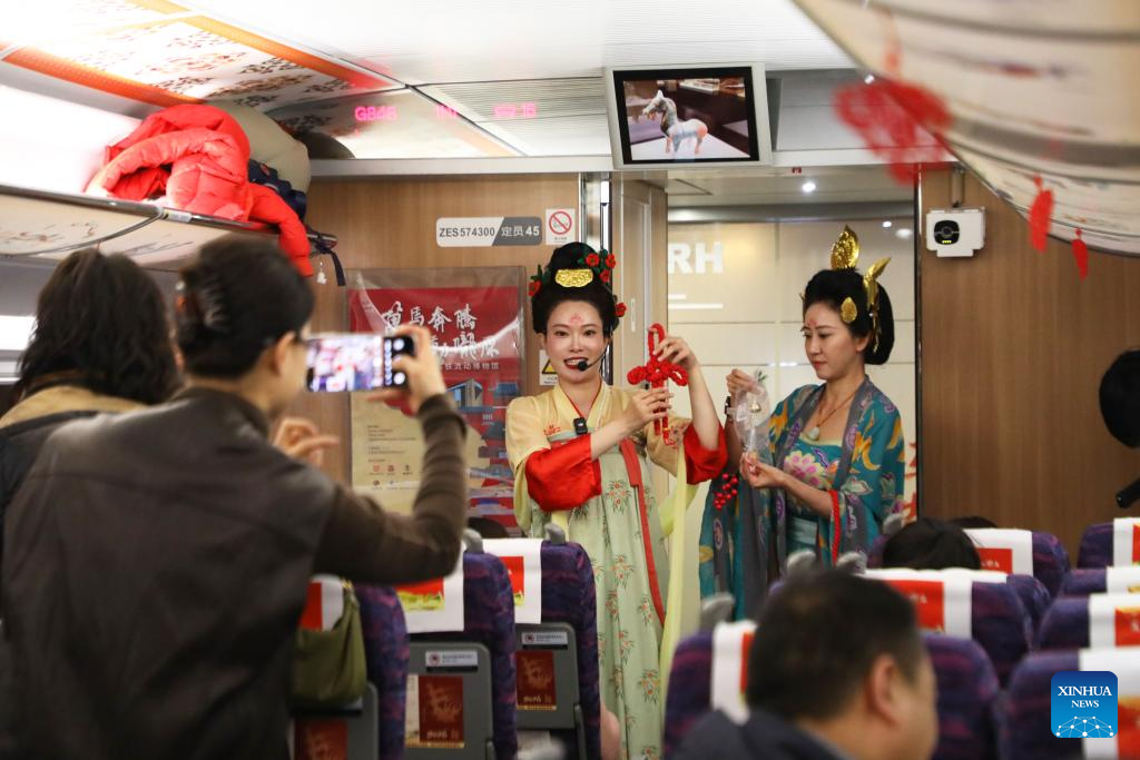 LANZHOU, 9 febrero, 2026 (Xinhua) -- Empleadas del museo presentan conocimiento cultural a los pasajeros a bordo del tren G848, en la provincia de Gansu, en el noroeste de China, el 9 de febrero de 2026. Como parte del programa del museo móvil del ferrocarril de alta velocidad, el tren G848, con intérpretes de reliquias culturales, partió el lunes de la Estación de Ferrocarril Oeste de Lanzhou con destino a la Estación de Ferrocarril Sur de Guangzhou. Nueve de los museos nacionales de primer nivel de China en Gansu, incluyendo la Academia de Dunhuang y el Museo Provincial de Gansu, han llevado el patrimonio cultural de Gansu a bordo del tren, permitiendo a los pasajeros conectar con la historia y conocer las costumbres tradicionales durante la temporada alta de viajes de Fiesta de la Primavera. (Xinhua/Zhang Zhimin)