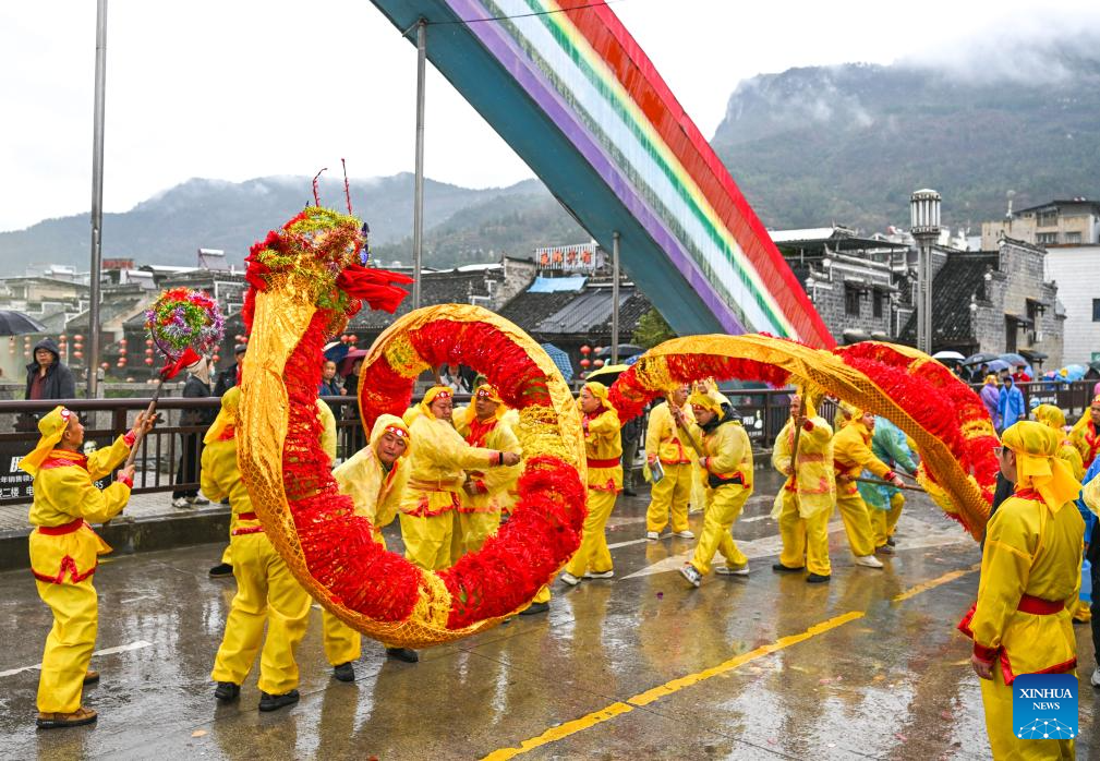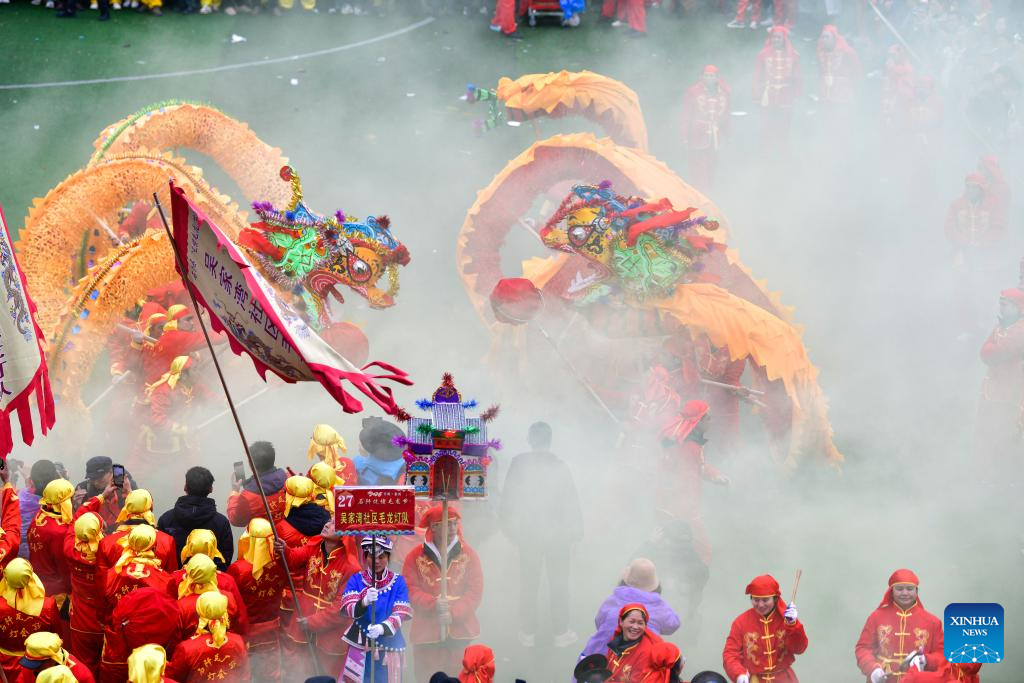 Residentes realizan la danza del dragón durante el "Festival Malong" del grupo étnico yilao, en el distrito de Shiqian, en la provincia de Guizhou, en el suroeste de China, el 27 de febrero de 2026. El Festival Maolong, una actividad folclórica del pueblo del grupo étnico yilao para marcar la Fiesta de la Primavera y el festival de las linternas, fue enlistado como patrimonio cultural inmaterial nacional en 2006. (Xinhua/Yang Wenbin)