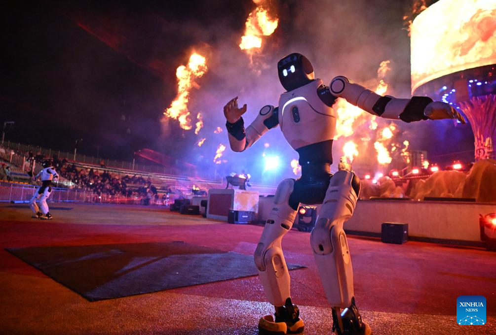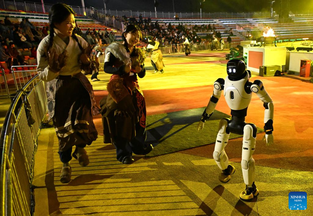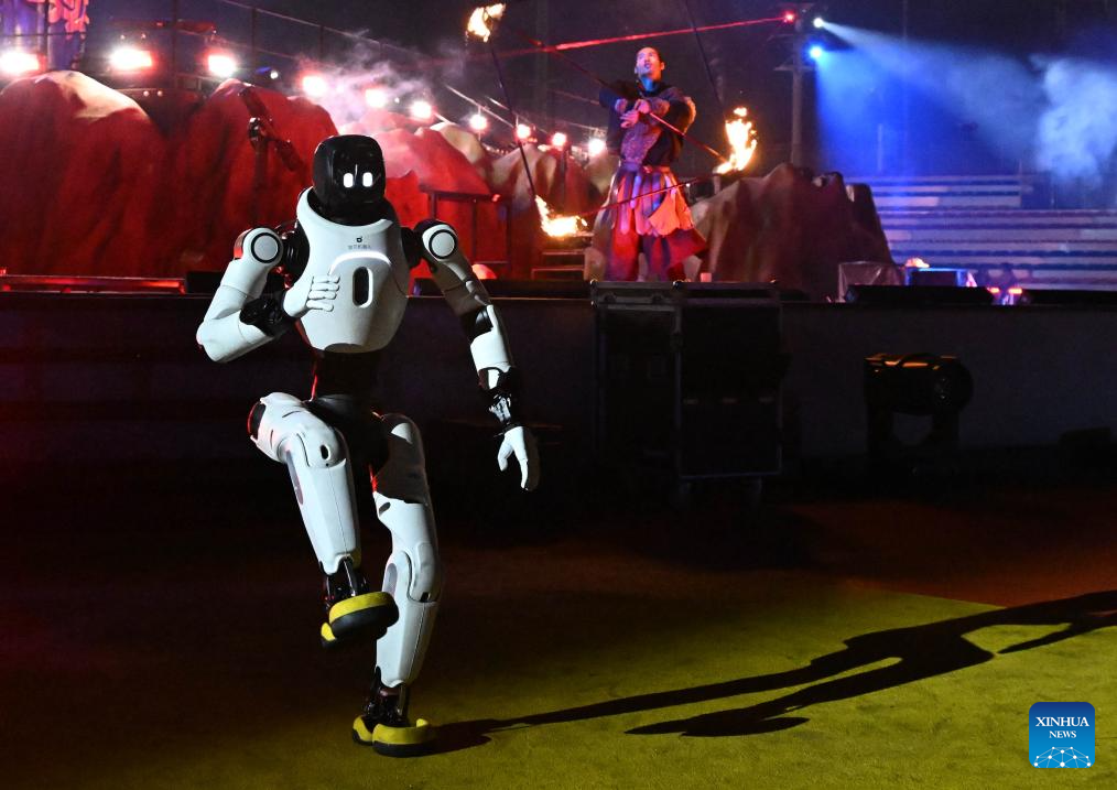Imagen del 26 de febrero de 2026 de un robot humanoide presentándose durante un espectáculo de acción en vivo con temática mítica en un área escénica, en Qingdao, en la provincia de Shandong, en el este de China. (Xinhua/Li Ziheng)