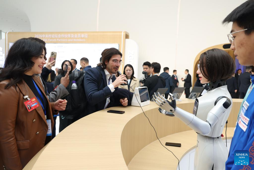 Invitados interactúan con un robot humanoide en el Centro Internacional de Innovación de Zhongguancun, en Beijing, capital de China, el 25 de marzo de 2026. El Foro Zhongguancun 2026 se lleva a cabo del 25 al 29 de marzo bajo el tema "Integración plena entre la innovación tecnológica y la innovación industrial". (Xinhua/Jin Liwang)