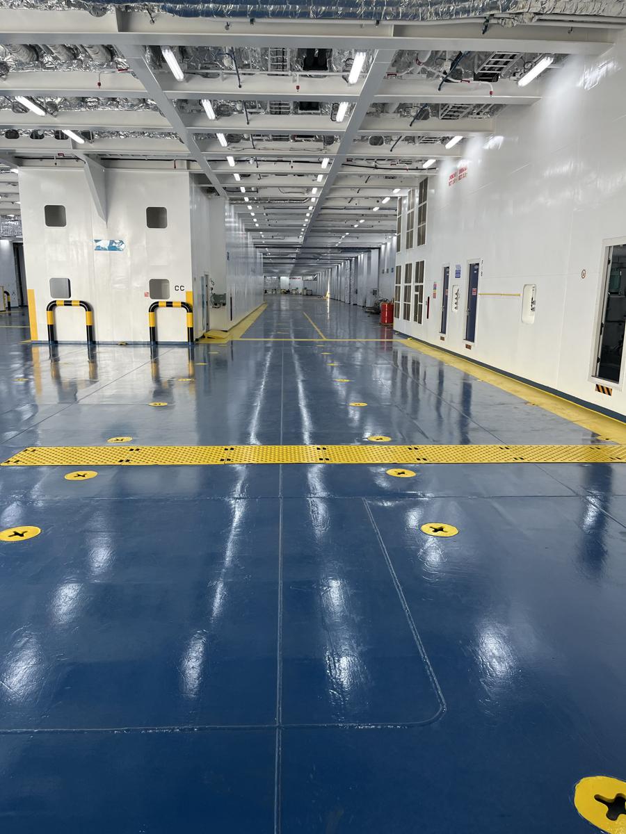 El buque también está equipado con siete ascensores para facilitar su movimiento y tiene capacidad para más de 550 automóviles o 150 remolques portacontenedores de 40 pies en su carril de 2.800 metros.