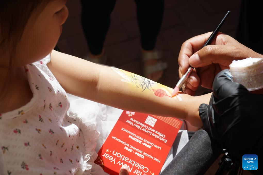 NEWPORT BEACH, 1 marzo, 2026 (Xinhua) -- Imagen del 28 de febrero de 2026 de una niña experimentando la pintura corporal durante una muestra de viajes invernal, organizado por la Oficina Nacional de Turismo de China en Los Angeles, en Newport Beach, California, Estados Unidos. (Xinhua/Zeng Hui)