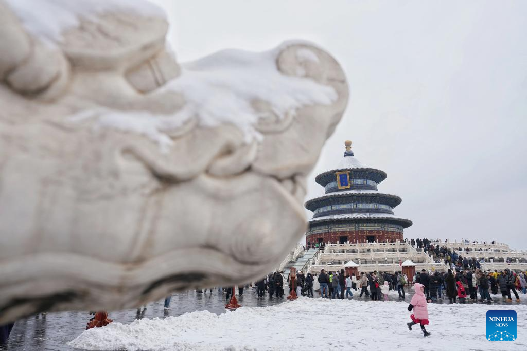 Turistas visitan el parque Tiantan (Templo del Cielo), en Beijing, capital de China, el 5 de marzo de 2026. Beijing fue testigo de una nevada primaveral del miércoles al jueves. (Xinhua/Ju Huanzong)