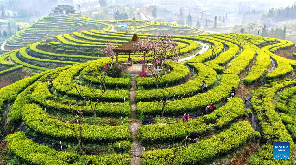 BEIJING, 13 marzo, 2026 (Xinhua) -- Vista aérea tomada con un dron el 13 de marzo de 2026 de agricultores recolectando hojas de té en un jardín de té, en el poblado de Longquan, en el distrito de Danzhai, en la provincia de Guizhou, en el suroeste de China. (Xinhua/Yang Wukui)