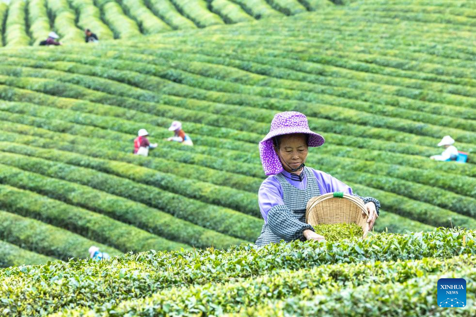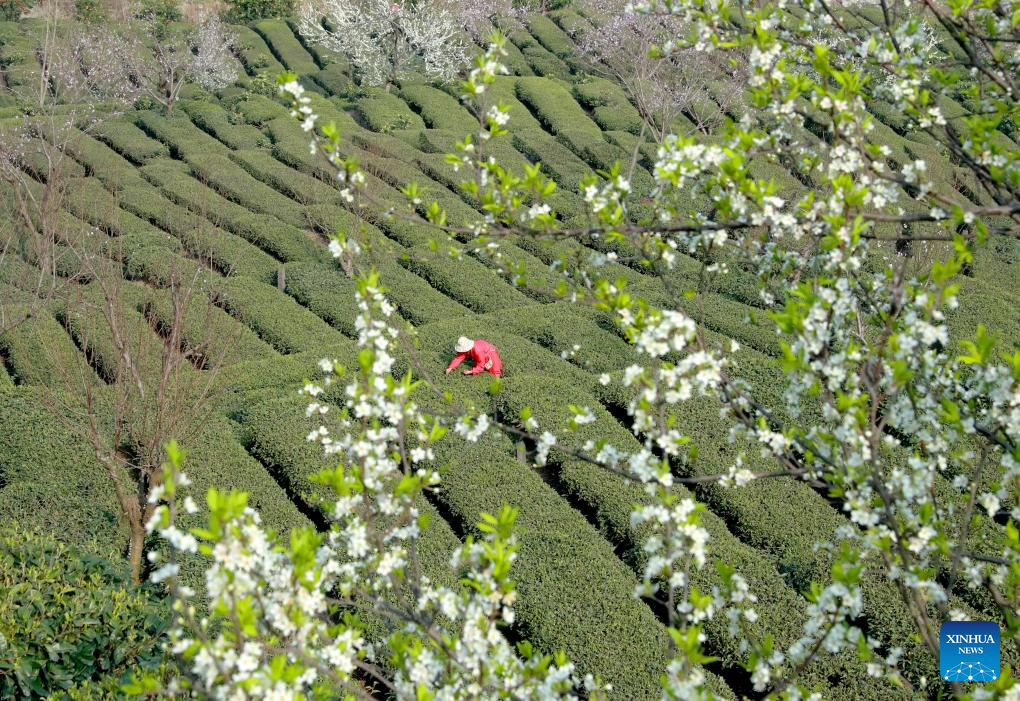 BEIJING, 13 marzo, 2026 (Xinhua) -- Agricultores recolectan hojas de té en un jardín de té, en el distrito de Xixiu de la ciudad de Anshun, en la provincia de Guizhou, en el suroeste de China, el 13 de marzo de 2026. (Xinhua/Chen Xi)