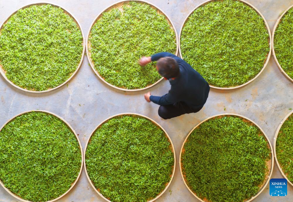 BEIJING, 13 marzo, 2026 (Xinhua) -- Vista aérea tomada con un dron el 13 de marzo de 2026 de un agricultor secando hojas de té en un jardín de té, en el distrito de Hengnan de la ciudad de Hengyang, en la provincia de Hunan, en el centro de China. (Xinhua/Cao Zhengping)