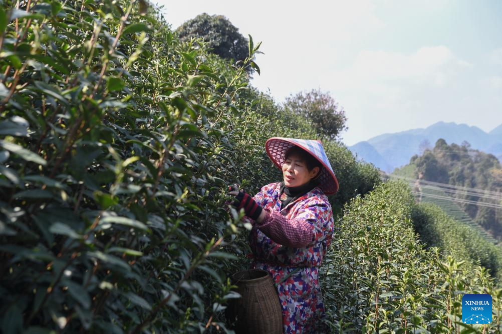 BEIJING, 13 marzo, 2026 (Xinhua) -- Imagen del 12 de marzo de 2026 de una agricultora recolectando hojas de té en un jardín de té, en el distrito de Wuyi, en la ciudad de Jinhua de la provincia de Zhejiang, en el este de China. (Xinhua/Shi Kuanbing)