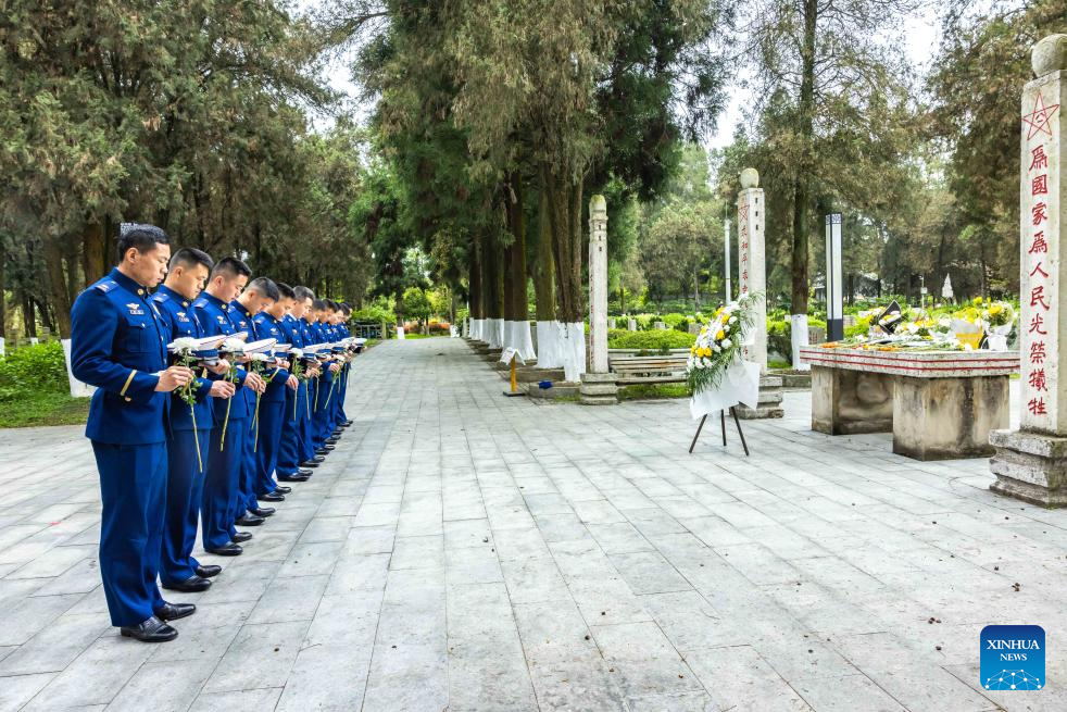 Personas rinden tributo a los mártires en un cementerio de mártires, en la ciudad de Anshun, en la provincia de Guizhou, en el suroeste de China, el 5 de abril de 2026. Personas de todo el país participaron en varias actividades para rendir homenaje a los mártires durante el Festival Qingming, o Día de la Limpieza de Tumbas, el domingo este año. (Xinhua/Chen Xi)