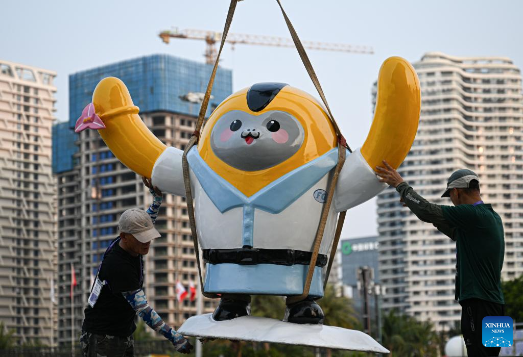 Imagen del 10 de abril de 2026 de trabajadores levantando una mascota de la VI Exposición Internacional de Productos de Consumo de China (CICPE, por sus siglas en inglés) en el Centro Internacional de Convenciones y Exposiciones de Hainan, sede principal para la próxima VI CICPE, en Haikou, en la provincia de Hainan, en el sur de China. Programada para llevarse a cabo en la provincia de Hainan, en el sur de China, del 13 al 18 de abril, esta exposición contará con la participación de más de 3.400 marcas de más de 60 países y regiones. (Xinhua/Pu Xiaoxu)