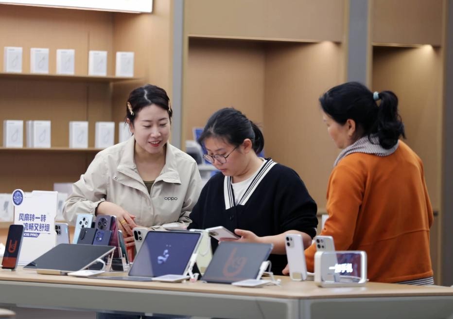 | Consumidores compran teléfonos inteligentes en un centro comercial de Leshan, provincia de Sichuan, en el suroeste de China. (Foto/Li Huashi) |